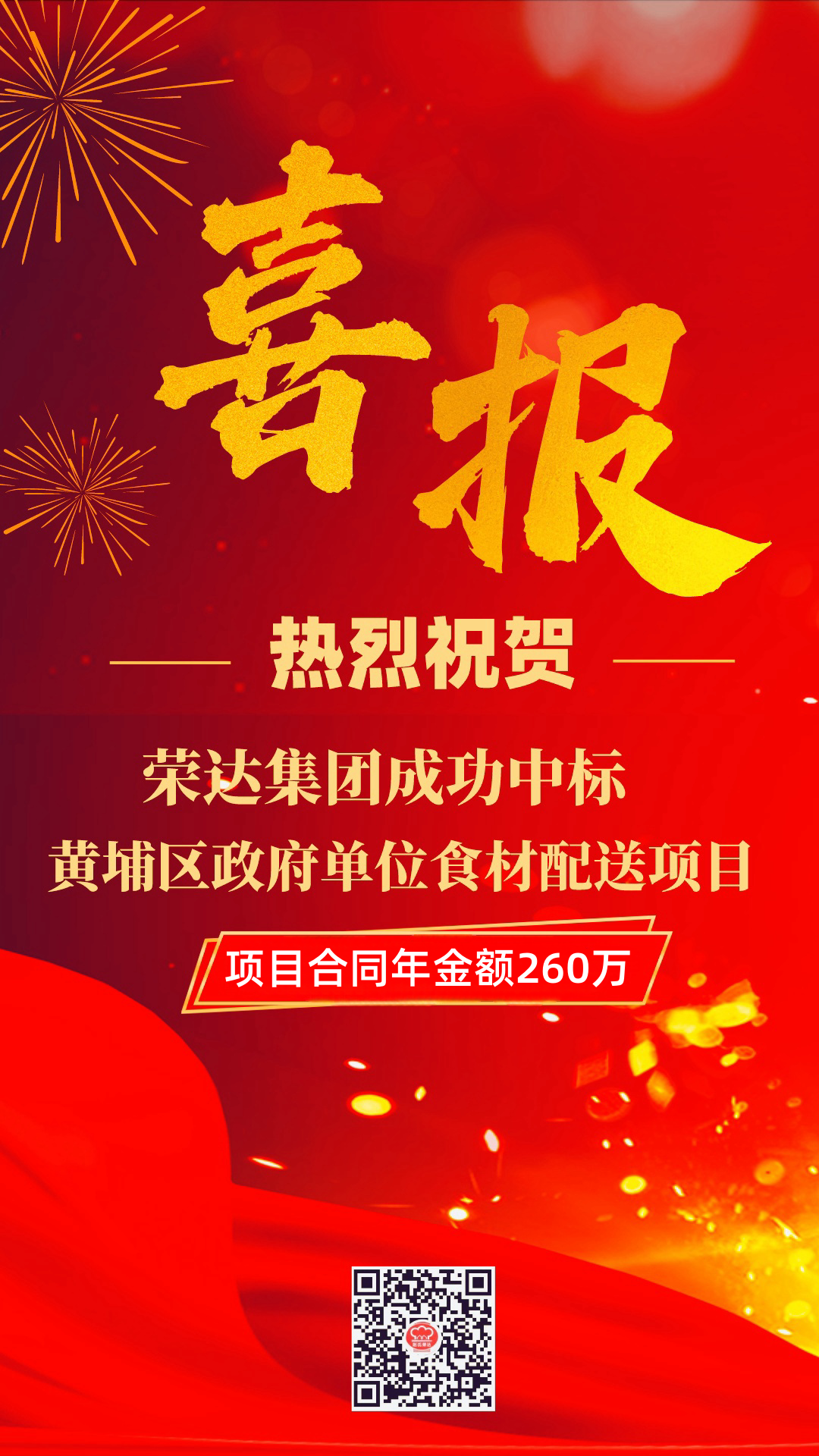 喜讯!祝贺荣达集团成功中标黄埔区政府单位食材配送项目,项目合同年金额260万。